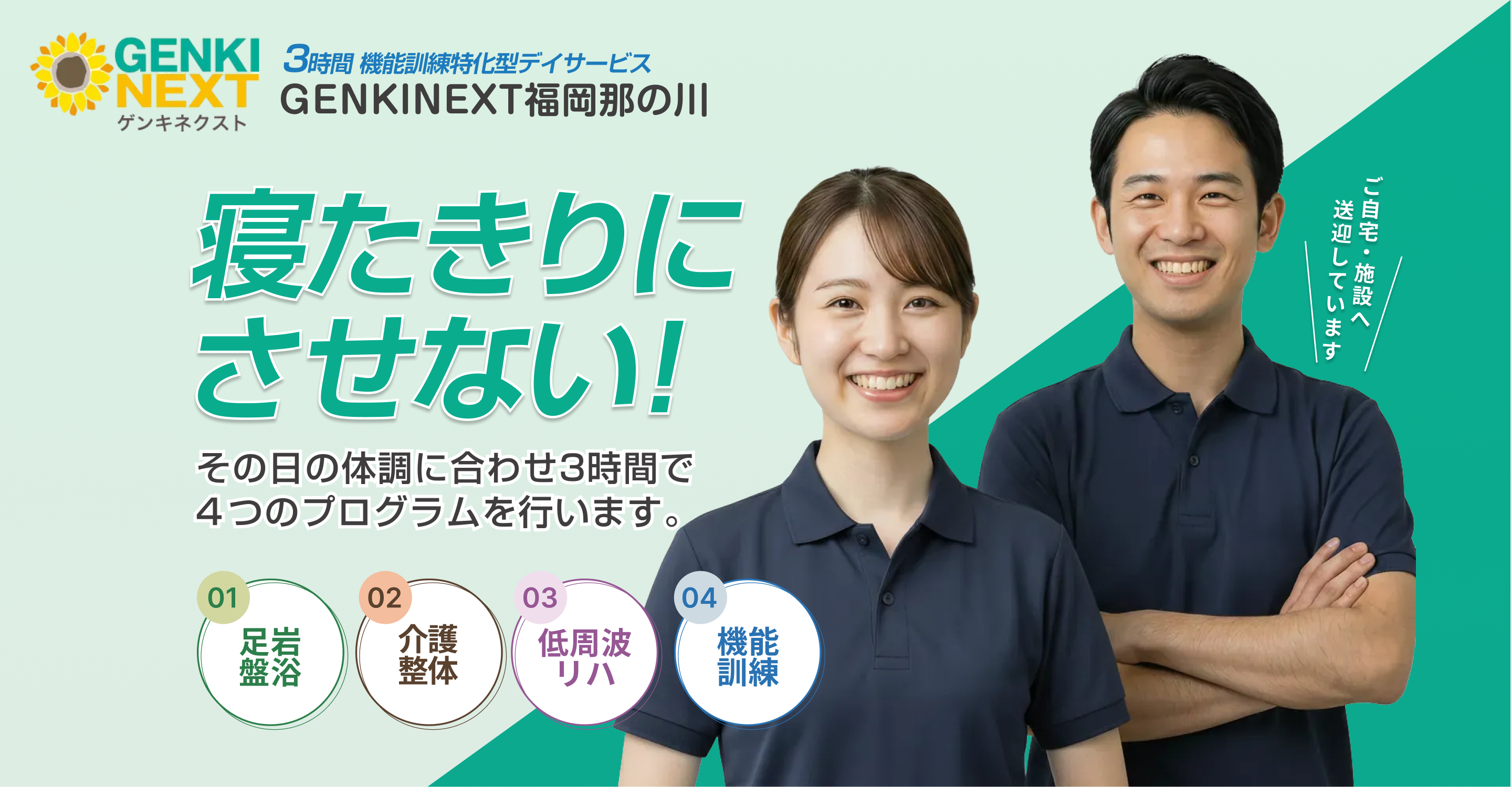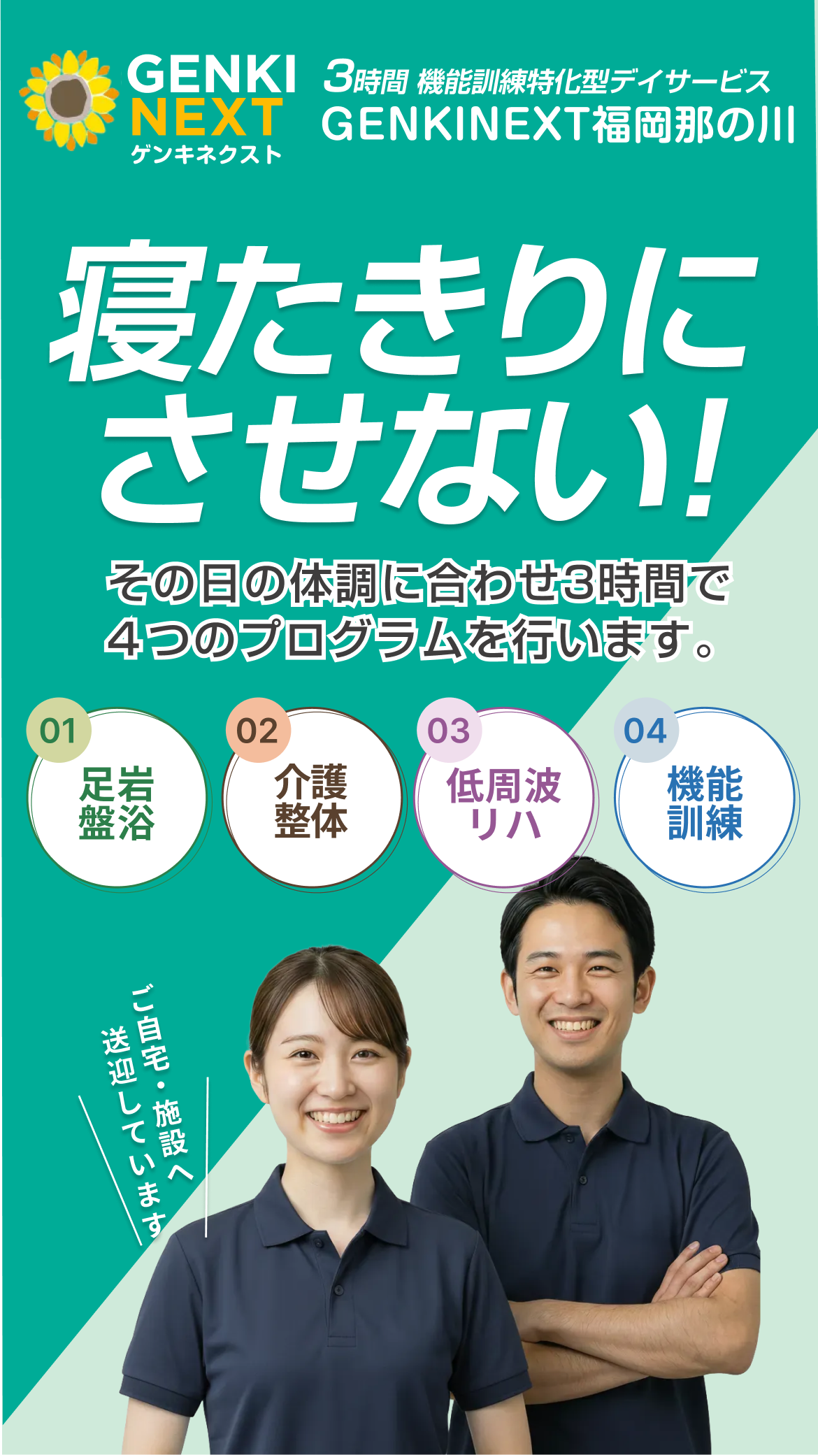 その想いから介護事業へ参入し、12年前に地域密着型通所介護「GENKINEXT福岡那の川」をフランチャイズ事業として開設いたしました。さらに、訪問マッサージ事業「GENKISUN福岡中央」も展開し、地域の皆さまの暮らしを支える取り組みを続けております。